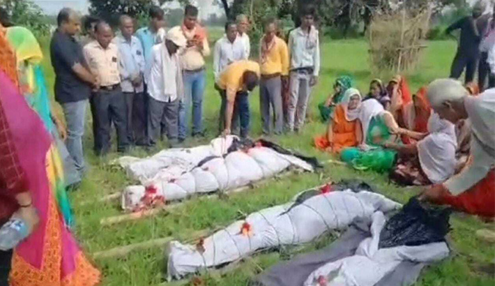 भोपाल के रातीबड़ में भूपेंद्र विश्वकर्मा (38) ने गुरुवार को अपने दोनों बच्चों ऋषिराज (9) और ऋतुराज (3) को जहर पिला दिया था। इसके बाद पत्नी रितु (35) के साथ फांसी लगाकर सुसाइड कर लिया था। गुरुवार-शुक्रवार की दरम्यानी रात तीन बजे परिजन चारों के शव लेकर पैतृक गांव अंबा पहुंचे। शुक्रवार सुबह अंतिम संस्कार के लिए चार अर्थी श्मशान घाट के लिए एक साथ रवाना हुईं, लेकिन परिजन शव लेकर हाईवे पर बैठ गए। मृतक भूपेंद्र के पिता शिवनारायण विश्वकर्मा का कहना है कि चारों का मर्डर किया गया है। इसको फांसी लगती तो इसकी जीभ और आंख निकल आती, लेकिन किसी के साथ भी ऐसा नहीं हुआ। मेरे पोतों को उल्टी भी नहीं हुआ। जहर पिलाते तो उल्टी होती। इसकी CBI जांच की जाए। भूपेंद्र का मर्डर होने के पहले ही पुलिस में केस भी दर्ज कराया गया था।