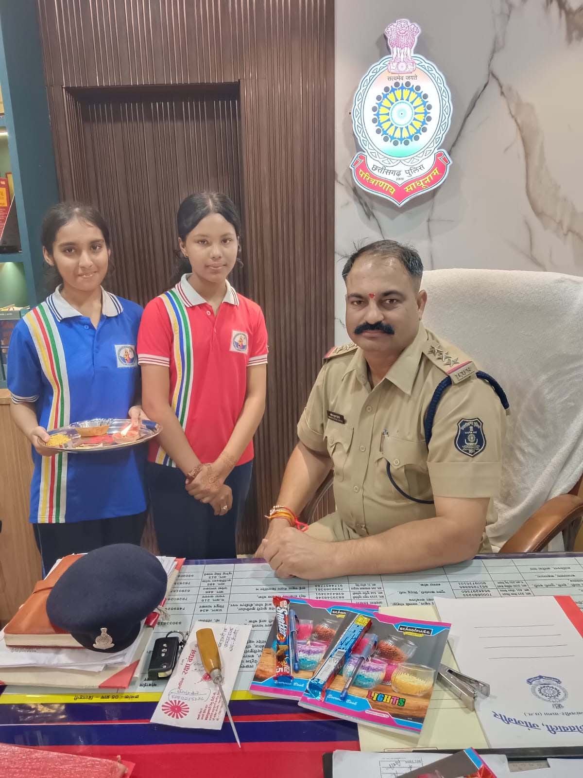इसी क्रम में थाना प्रभारी कोतवाली जांजगीर प्रवीण कुमार द्विवेदी के पहल से जय भारत इंग्लिश मीडियम स्कूल जांजगीर के (छात्राओं) बच्चियों के हाथो स्वयं तथा थाना जांजगीर में पदस्थ पुलिस स्टाफ के हाथ में रक्षा बंधन बांधवा कर पर्व मनाया गया। इस अवसर पर बच्चियों को थाना प्रभारी जांजगीर द्वारा कापी/पेन भेंट कर रक्षा बंधन की शुभकामनाएं दी गई।