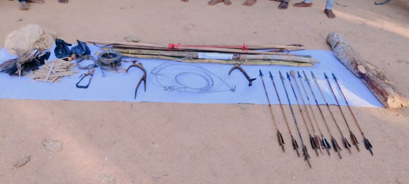 बड़ी मात्रा के शिकार करने का फंदा धनुष तीर समान बरामद।