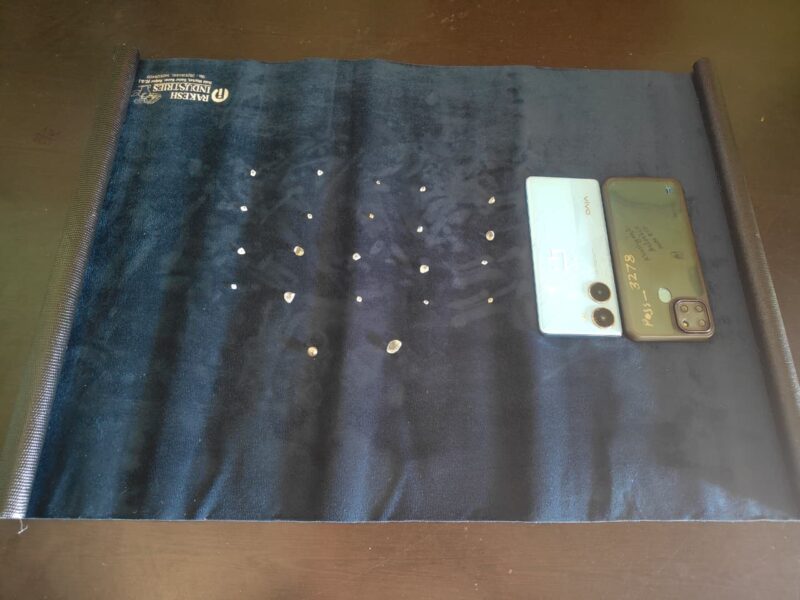 तलाशी के दौरान दोनों आरोपियों के कब्जे से बहुमूल्य चमकीले हीरा जैसे खनिज पदार्थ कुल 22 नग, अनुमानित कीमत ₹2,30,000/-।