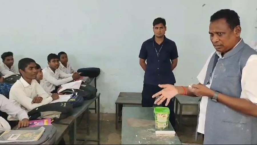 गरियाबंद। बिंद्रानवागढ़ के कांग्रेस विधायक जनक ध्रुव आज अचानक मैनपुर हायर सेकंडरी स्कूल पहुंचे और सीधे विद्यालय के दसवीं कक्षा पहुचे और छात्र-छात्राओं को इतिहास, समाजिक विज्ञान का विषय लगभग एक घण्टे तक पढ़ाया बच्चों को यह पता था की उन्हे पढ़ाने वाले कोई सामान्य शिक्षक होगा, जिसकी नही पोस्टिंग हुई होगी, चूंकि विधायक ध्रुव किसी काफिले में नही बल्कि स्कूटी से स्कूल पहुंचे थे।