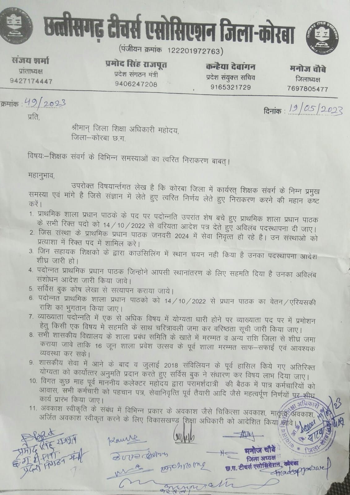 संघ के पदाधिकारी प्रमोद सिंह राजपूत,कन्हैया लाल देवांगन, मनोज चौबे,नरेंद्र चंद्रा, प्रदीप जयसवाल,उपेंद्र राठौर,मनीराम साहू,जय कुमार कमल,शोभाराम चंद्रा द्वारा सौपे गए मांगों का ज्ञापन में प्रमुख रूप से प्रधान पाठक के शेष बचे रिक्त सभी पदों पर पदोन्नति,14 प्रधान पाठक जो स्थान चयन से इन्कार किए हैं उनको शीघ्र पदस्थापना आदेश जारी, जो प्रधान पाठक जनवरी 2024 में सेवानिवृत्त हो रहे हैं उस संस्था को प्रत्याशा में रिक्त पद माना जावे,आपसी सहमति से संशोधन आदेश जारी, पदोन्नत प्रधान पाठकों को पात्रता अनुसार 14 अक्टूबर 2022 से वेतन एवं एरियर राशि का भुगतान किया जावे,सर्विस बुक कोष लेखा से सत्यापन,व्याख्याता पदोन्नति हेतु किसी एक विषय पर सहमति लेकर वरिष्ठता सूची जारी करना, सभी स्कूलों को मरम्मत एवं अन्य राशि जिला से शीघ्र जारी करें,2018 के पूर्व हासिल किए गए अतिरिक्त योग्यता को कार्योत्तर अनुमति प्रदान कर सर्विस बुक संधारण किया जाए, परामर्श दात्री की बैठक मे माननीय कलेक्टर महोदय द्वारा पात्र कर्मचारियों को आवास, सभी कर्मचारियों का पहचान पत्र एवं सेवा निवृत्त पूर्व तैयारी जैसे लिए गए महत्वपूर्ण निर्णय पर शीघ्र कार्य शुरू किया जावे। विभिन्न प्रकार के अवकाश स्वीकृत हेतु बीईओ को आदेशित किया जाए।