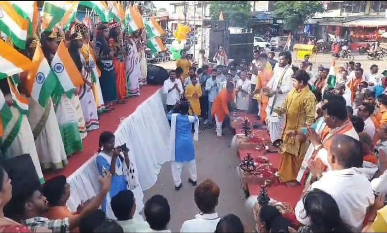 गरियाबंद। 78 वे स्वतंत्रता दिवस के मौके पर राजिम विधायक रोहित साहू ने अभिनव पहल कर तिरंगा यात्रा के दौरान 78 भारत माता के प्रतिरूपों को तैयार कर भव्य महाआरती की जो प्रदेश में चर्चा का विषय बना हुआ है, तिरंगा यात्रा राजिम तहसील मुख्यालय से पोखरा, बासीन, बोरसी, कौँदकेरा, तरीघाट, पाण्डुका, कोपरा होते हुए राजिम में समाप्त हुई। जहां भारत माता के परिधान में सुसज्जित 78 बालिकाओं की महाआरती की गई।