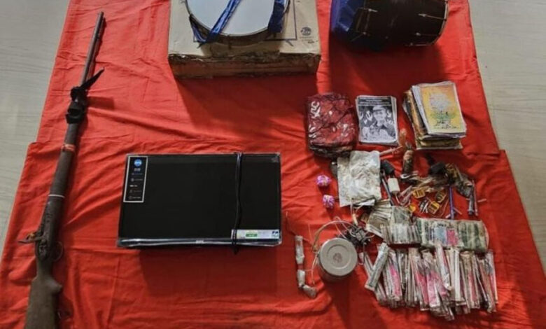 1.भरमार बंदूक 1 नग, 2. TV (बीपीएल कंपनी)1 नग, 3.टिफिन बम 1 नग, 4. प्रेसर आईईडी स्विच 1 नग, 5.सिंरिंज 49 नग, 6.ढफली 1 नग, 7.ढोलक 1 नग, 8 बम फटाका 2 नग, 9. मोबाईल चार्जर 2 नग, 10. बैटरी पिन 1 नग, 11. नक्सली बेनर 1 नग, 12. नक्सली साहित्य 25 नग, 13. नक्सली नोट बुक 10 नग, 14.दवाईयॉं शामिल हैं।