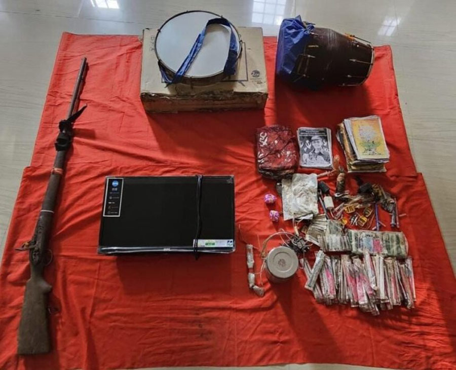 1.भरमार बंदूक 1 नग, 2. TV (बीपीएल कंपनी)1 नग, 3.टिफिन बम 1 नग, 4. प्रेसर आईईडी स्विच 1 नग, 5.सिंरिंज 49 नग, 6.ढफली 1 नग, 7.ढोलक 1 नग, 8 बम फटाका 2 नग, 9. मोबाईल चार्जर 2 नग, 10. बैटरी पिन 1 नग, 11. नक्सली बेनर 1 नग, 12. नक्सली साहित्य 25 नग, 13. नक्सली नोट बुक 10 नग, 14.दवाईयॉं शामिल हैं।