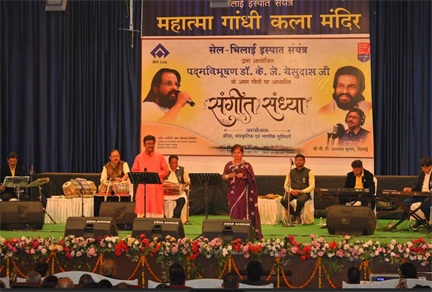 सेल- भिलाई इस्पात संयंत्र के क्रीड़ा, सांस्कृतिक एवं नागरिक सुविधाएँ विभाग द्वारा प्रसिद्ध गायक पद्मविभूषण श्री के. जे. येसुदास को समर्पित “येसुदास नाईट” संगीत संध्या का आयोजन दिनांक 27 दिसंबर, 2025 को महात्मा गांधी कला मंदिर में किया गया। कार्यक्रम में भिलाई इस्पात संयंत्र के विख्यात गायक श्री पी. टी. उल्लास कुमार ने अपनी सधी हुई एवं भावपूर्ण आवाज़ में के. जे. येसुदास के अमर गीतों को प्रस्तुत किया। इस विशेष संगीतमय संध्या में शास्त्रीय गायकी, भाव और संगीत साधना का अनुपम संगम देखने को मिला।