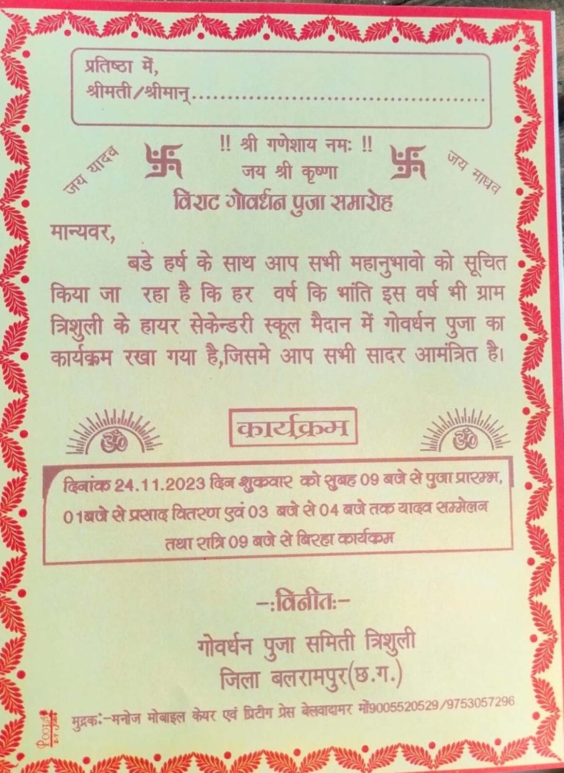 24 नवंबर को सुबह 9 बजे से पूजा आरंभ किया जाएगा तथा दोपहर 1 बजे महा प्रसाद वितरण किया जाएगा, 3 से 4बजे तक विशाल यादव सम्मेलन आयोजित किया गया है, साथ ही रात्रि में बिरहा सम्राट गायक सूरज यादव और नीलम राज के द्वारा बिरहा मुकाबला का कार्यक्रम आयोजित किया गया हैl जिसके लिए सभी तैयारी पूर्ण कर लिया गया है, साथ ही समिति के द्वारा लोगों को अधिक से अधिक संख्या में उपस्थिति दर्ज कराने की अपील की गई है l