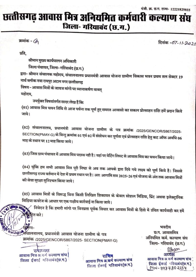 ज्ञापन में संघ के अध्यक्ष, सचिव और उपाध्यक्ष के हस्ताक्षर हैं और इसे संचालक, प्रधानमंत्री आवास योजना (ग्रामीण) नवा रायपुर को भी प्रेषित किया गया है।