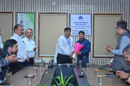 सेल–भिलाई इस्पात संयंत्र के कार्यपालक निदेशक (मानव संसाधन) श्री पवन कुमार ने दिनांक 26 नवम्बर, 2025 को इस्पात भवन में हाल ही में छत्तीसगढ़ लोक सेवा आयोग (सीजीपीएससी) की सिविल सेवा परीक्षा में टॉप करने वाले बीएसपी कर्मी श्री यशवंत देवांगन को विशेष रूप से सम्मानित किया। इस अवसर पर मुख्य महाप्रबंधक (मानव संसाधन) श्री संदीप माथुर, महाप्रबंधक (मानव संसाधन) श्री जे. एन. ठाकुर, महाप्रबंधक (सम्पर्क प्रशासन एवं जनसम्पर्क) श्री अमूल्य प्रियदर्शी, अध्यक्ष (ऑफिसर्स एसोसिएशन एवं सेफी) श्री एन. के. बंछोर, महाप्रबंधक (मानव संसाधन) सुश्री के. सुपर्णा, महाप्रबंधक (मानव संसाधन कार्यालय) श्री सौमिक डे, महासचिव (ऑफिसर्स एसोसिएशन) श्री अंकुर मिश्रा, कोषाध्यक्ष (ऑफिसर्स एसोसिएशन) सौभाग्य रंजन साहू, सेफी नॉमिनी (ऑफिसर्स एसोसिएशन) श्री अखिलेश मिश्रा सहित संयंत्र के वरिष्ठ अधिकारी उपस्थित रहे।
