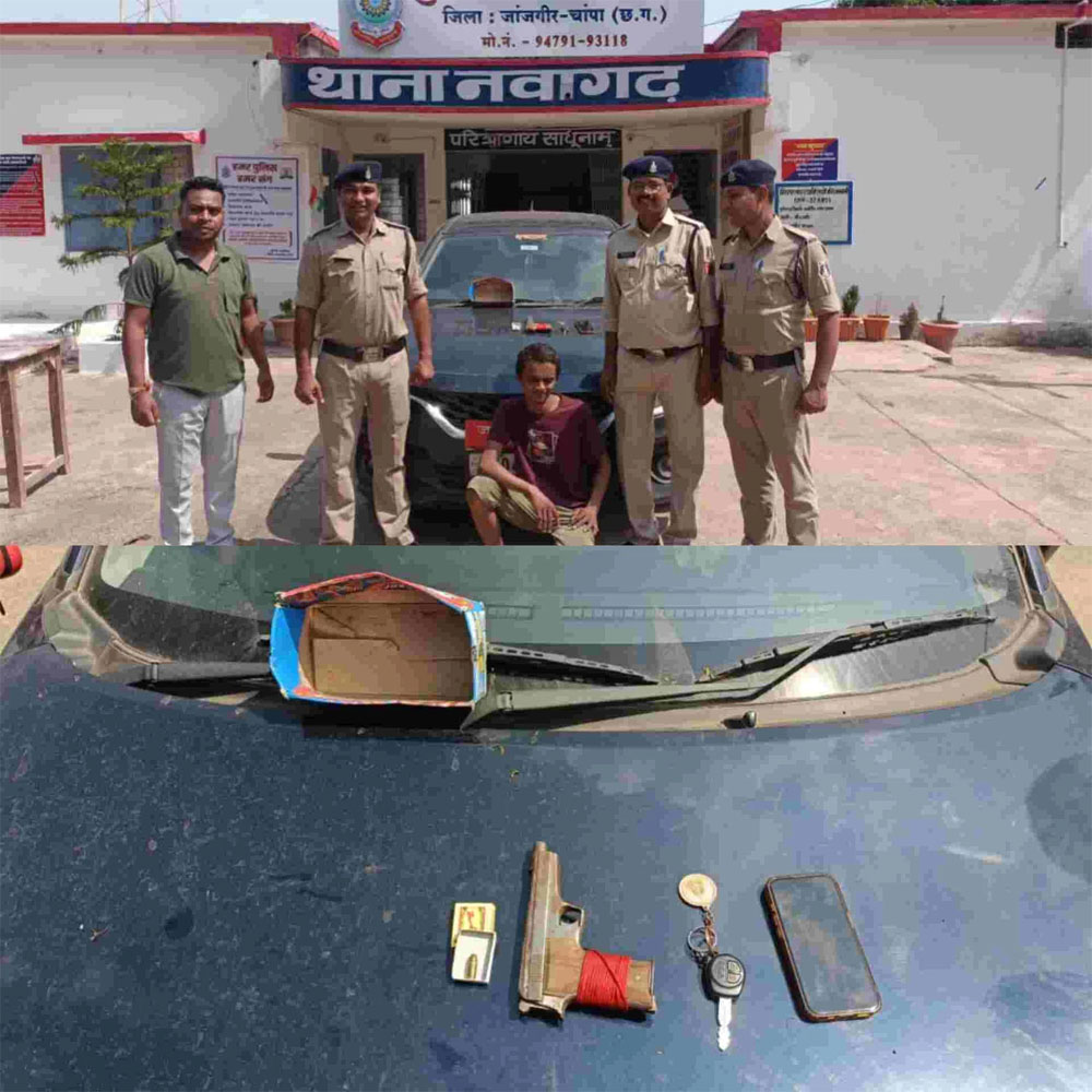 जो अपना नाम गुलशन उर्फ दीपांशु वर्मा पिता नरेन्द्र वर्मा उम्र 26 वर्ष निवासी बाजार चौक सिलतरा थाना धरसीवा रायपुर का रहने वाला बताया और रायपुर से थाना नवागढ़ क्षेत्र की अपनी प्रेमिका से मिलने आना बताया पूर्व में आरोपी की प्रेमिका रायपुर सिलतरा में काम करती थी उसी समय परिचय होना बताया जो अभी सिलतरा से काम छोड़कर वापस आ जाने पर उससे मिलने आया था। आरोपी बलेनों कार नीला रंग Cg -04-PA- 9622 में था। जिसका तलाशी लेने पर ड्रायवर सीट के पास एक स्नेकर का पैकेट खुला हुवा था जिसे चेक करने पर उसके अंदर एक देशी कट्टा और माचिस के डिब्बा के अंदर एक जिंदा कारतूस मिला आरोपी को देशी कट्टा और कारतूस के बारे में पूछताछ करने पर रायपुर सिलतरा क्षेत्र से किसी बाहरी व्यक्ति से खरीदना बताया।